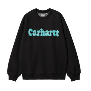 The Bubbles Sweatshirt is made of heavyweight cotton jersey which has been brushed, giving it a fleece-like backing. It is also cut in a balloon fit, which is a little looser and boxier, but also characterized by dropped shoulders and ribbed trims that create a cinching effect. A tactile puff print appears across the chest.