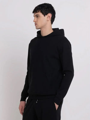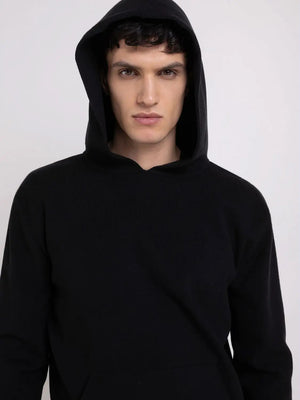 Sweater with hood made of stretch recycled poly. The long-sleeved garment features a comfort and relaxed fit. The item is enhanced by the kangaroo pocket.